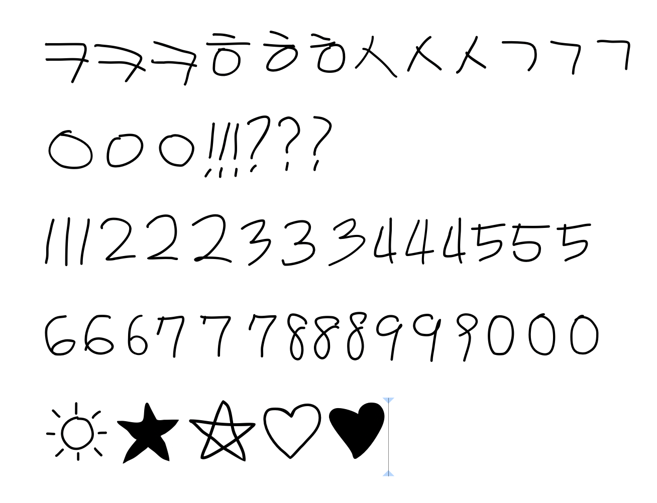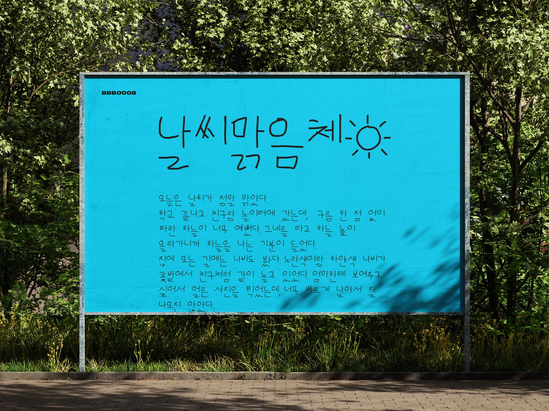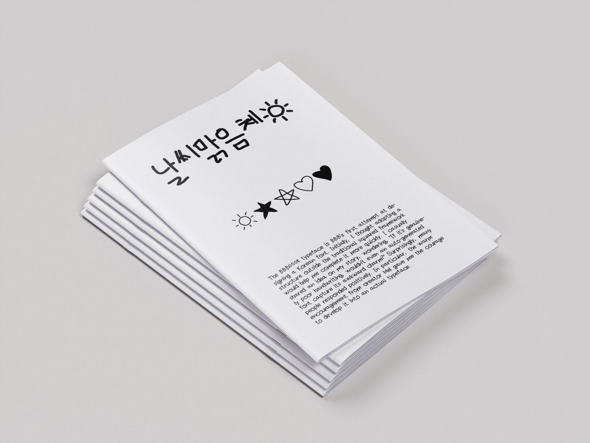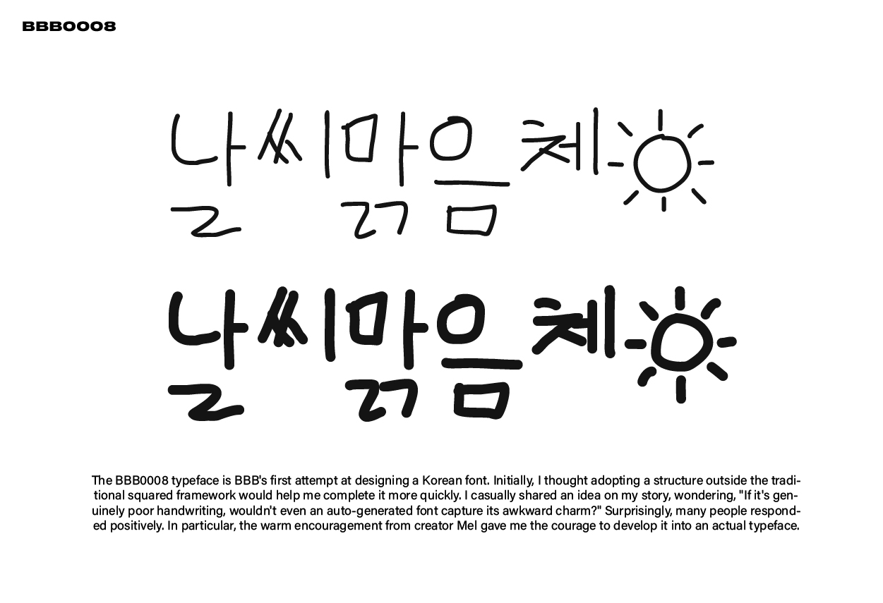 The BBB0008 typeface is BBB's first attempt at designing a Korean font. Initially, I thought adopting a structure outside the traditional squared framework would help me complete it more quickly. I casually shared an idea on my story, wondering, "If it's genuinely poor handwriting, wouldn't even an auto-generated font capture its awkward charm?" Surprisingly, many people responded positively. In particular, the warm encouragement from creator Merl gave me the courage to develop it into an actual typeface.